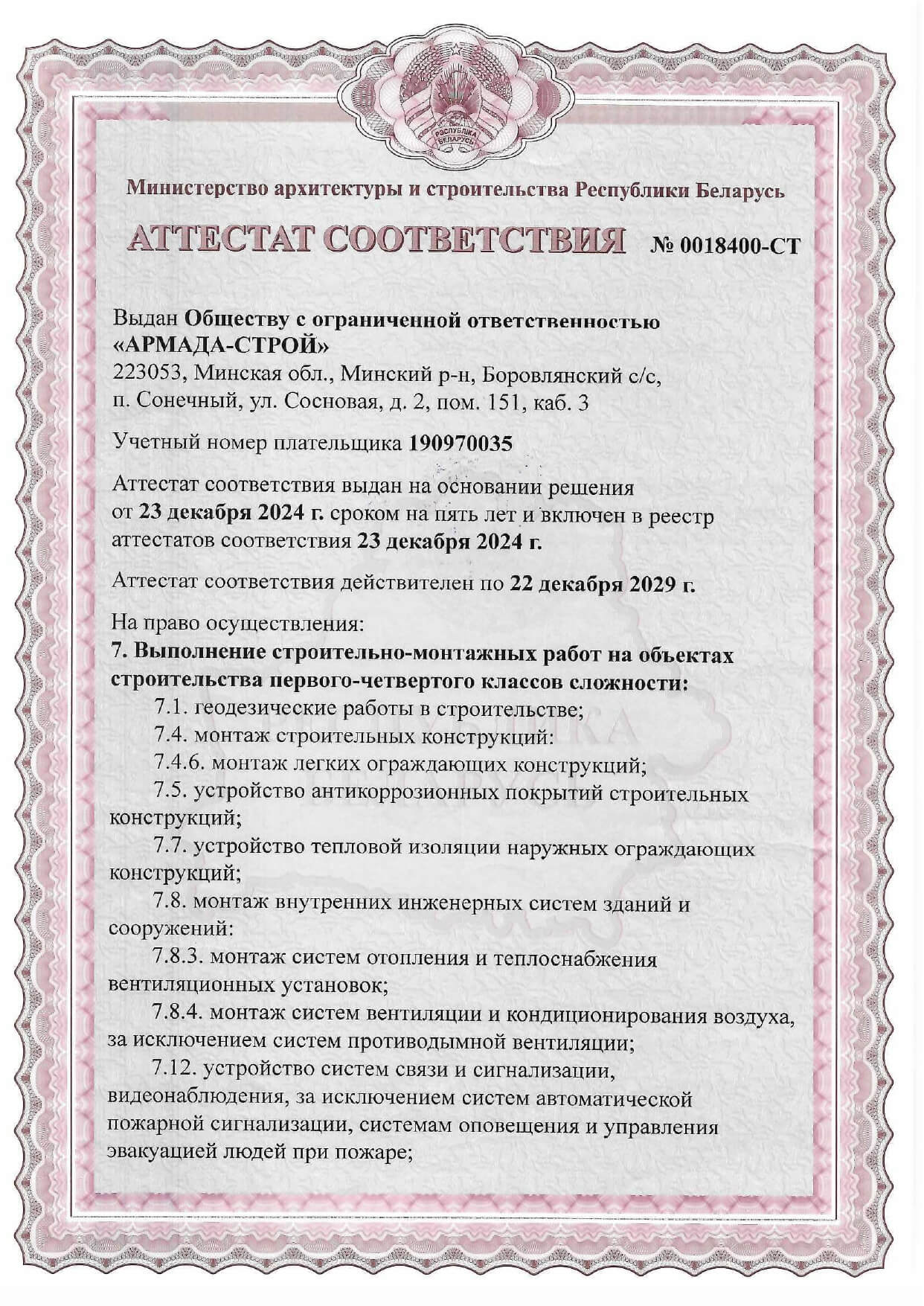 Для ведения строительной деятельности компания «Армада-Строй» располагает всей необходимой документацией подтверждающей свою компетентность: лицензии, свидетельства, аттестаты и сертификаты соответствия.