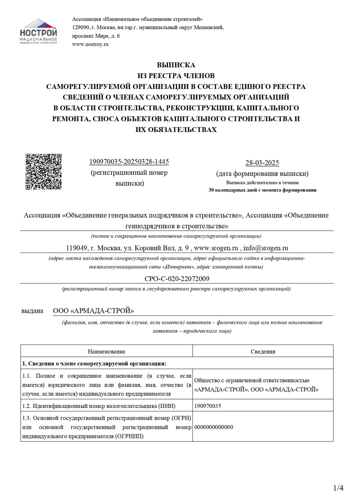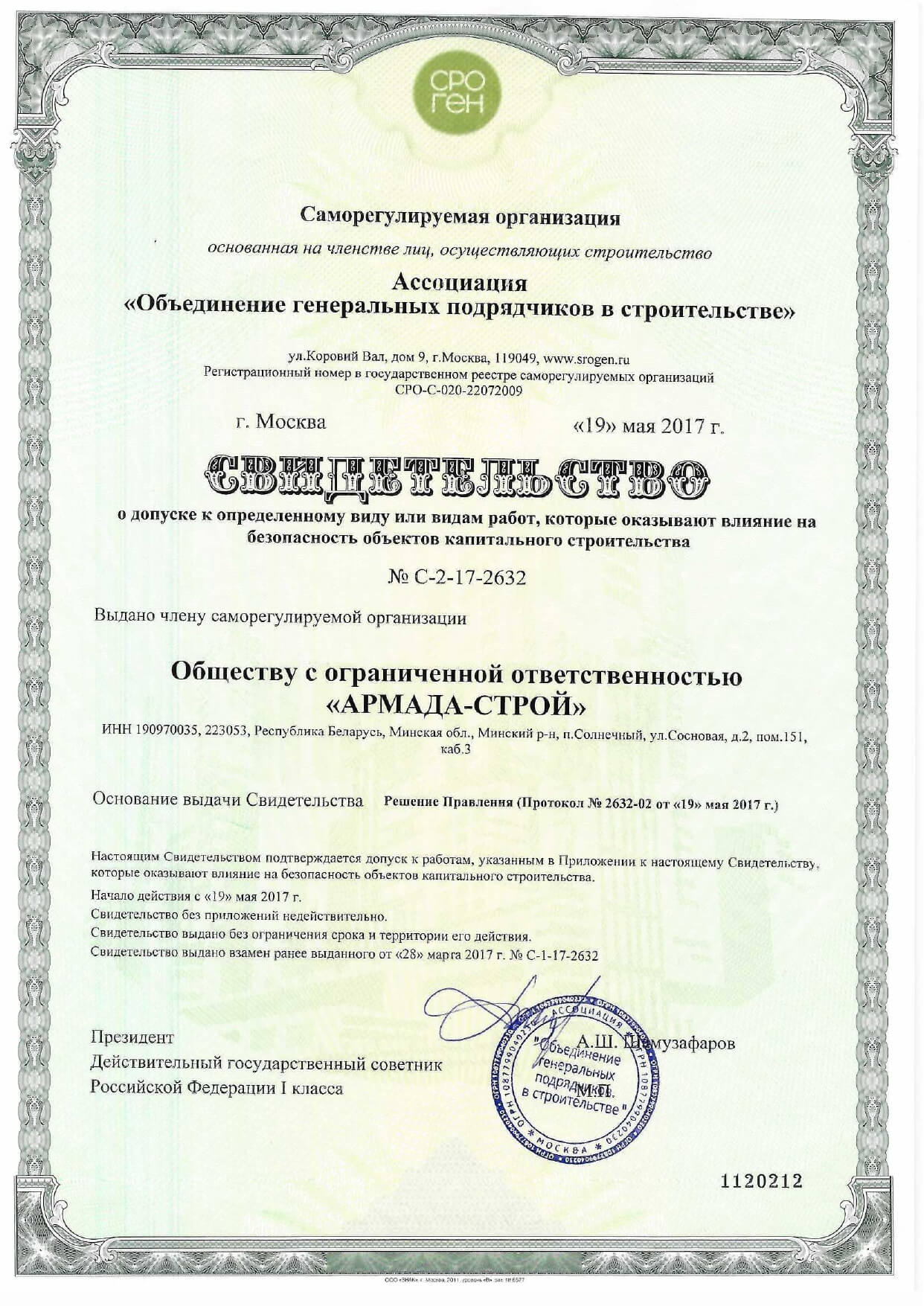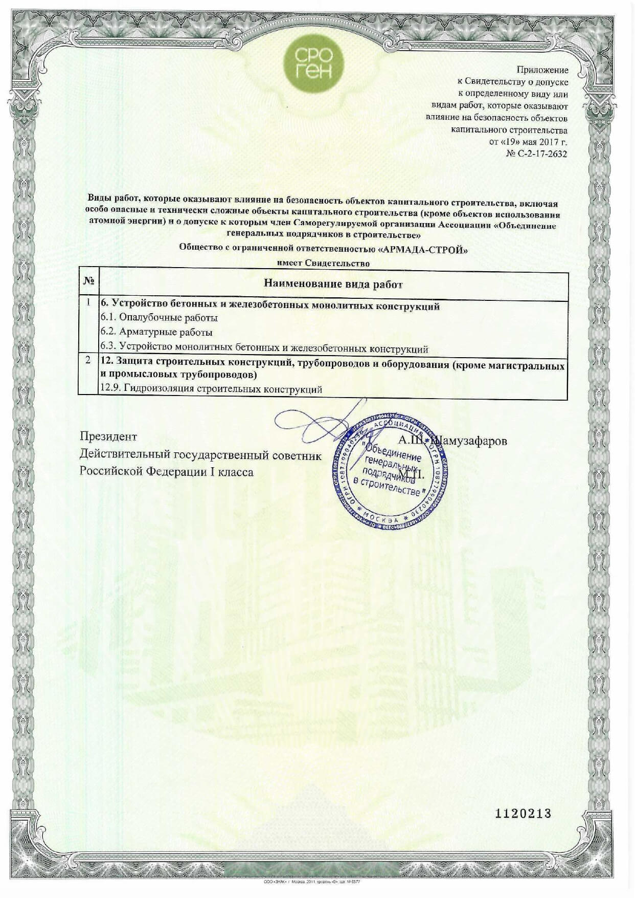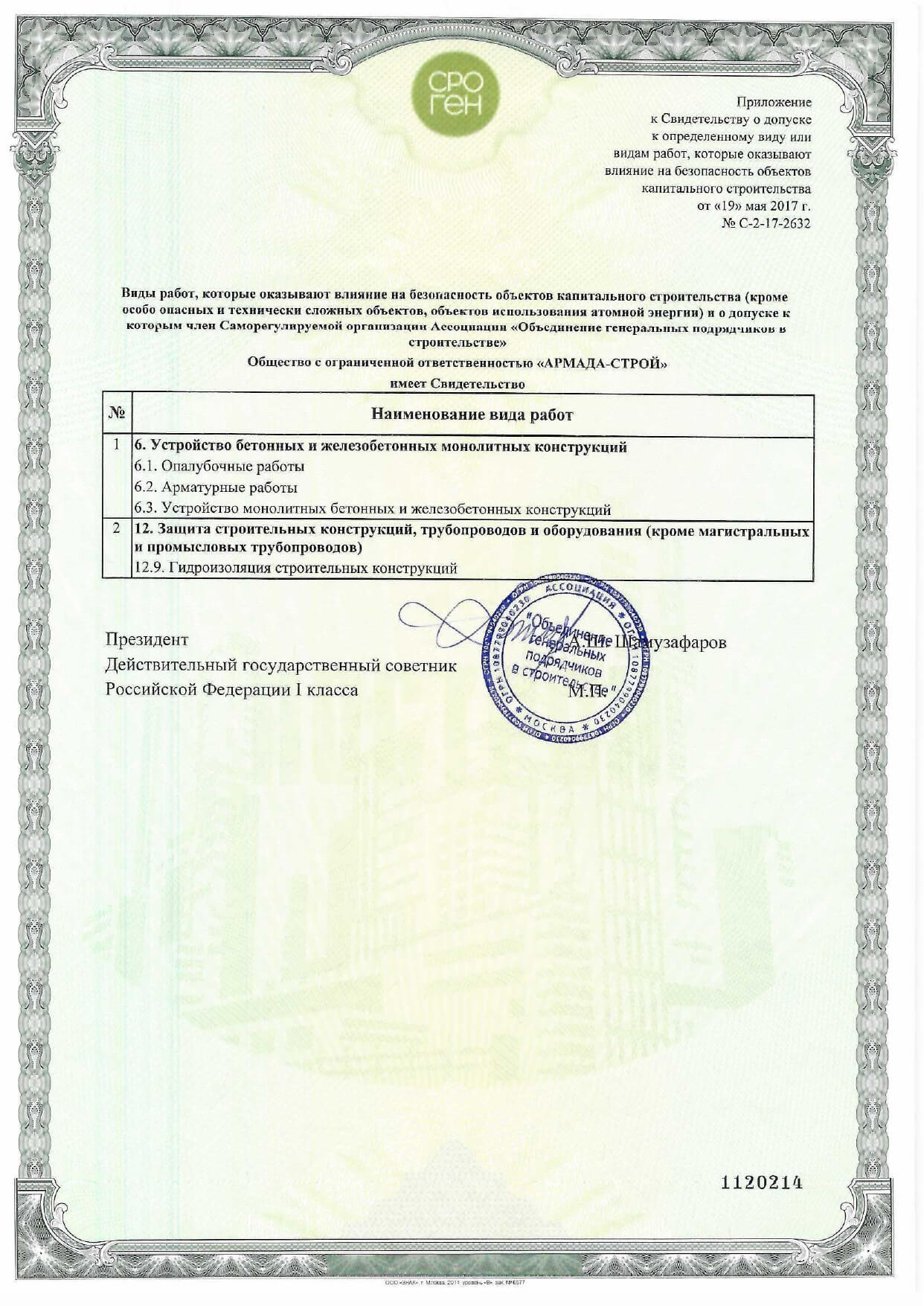 ООО «Армада-Строй» имеет аттестат соответствия третьей категории с выполнением функций генерального подрядчика объектов I-IV классов сложности, а также лицензию на право осуществления деятельности в области промышленной безопасности.