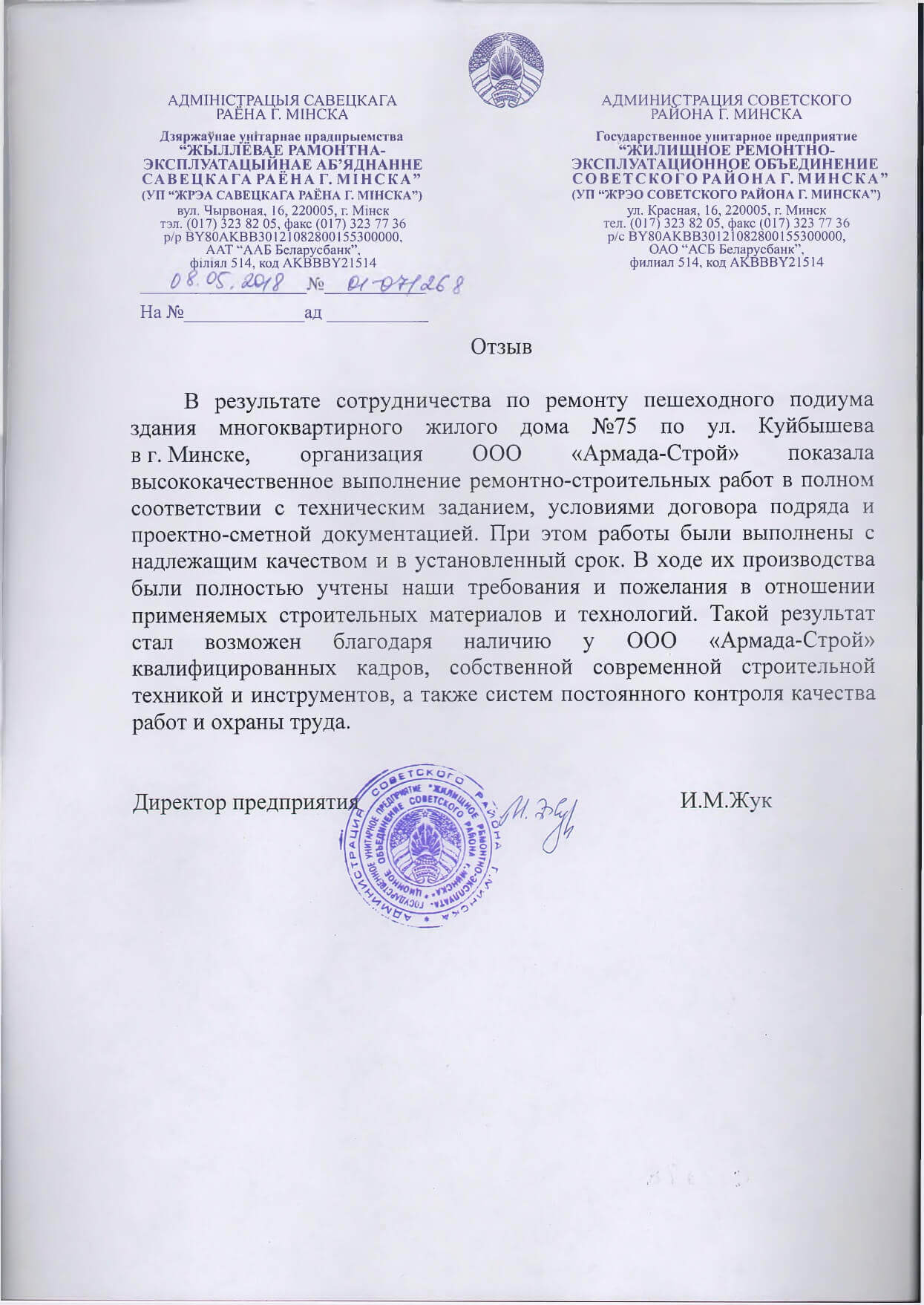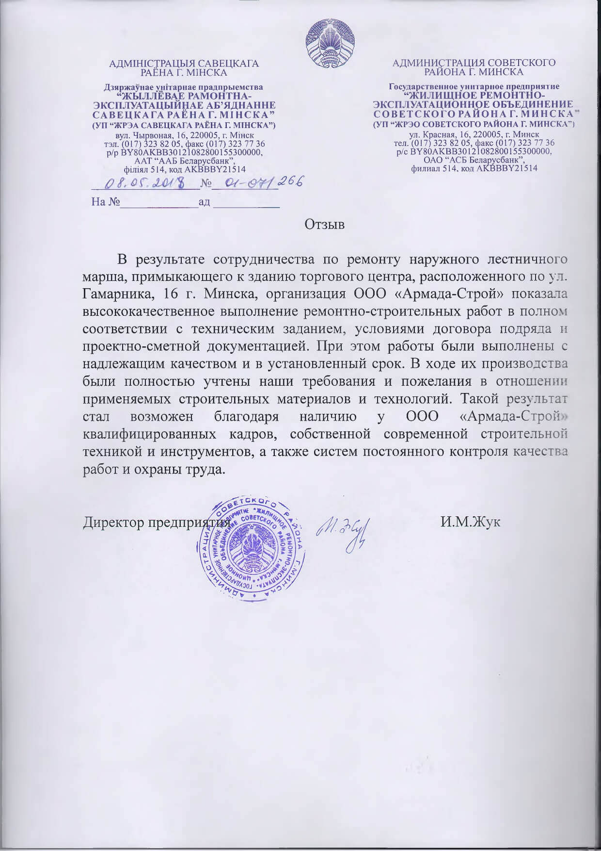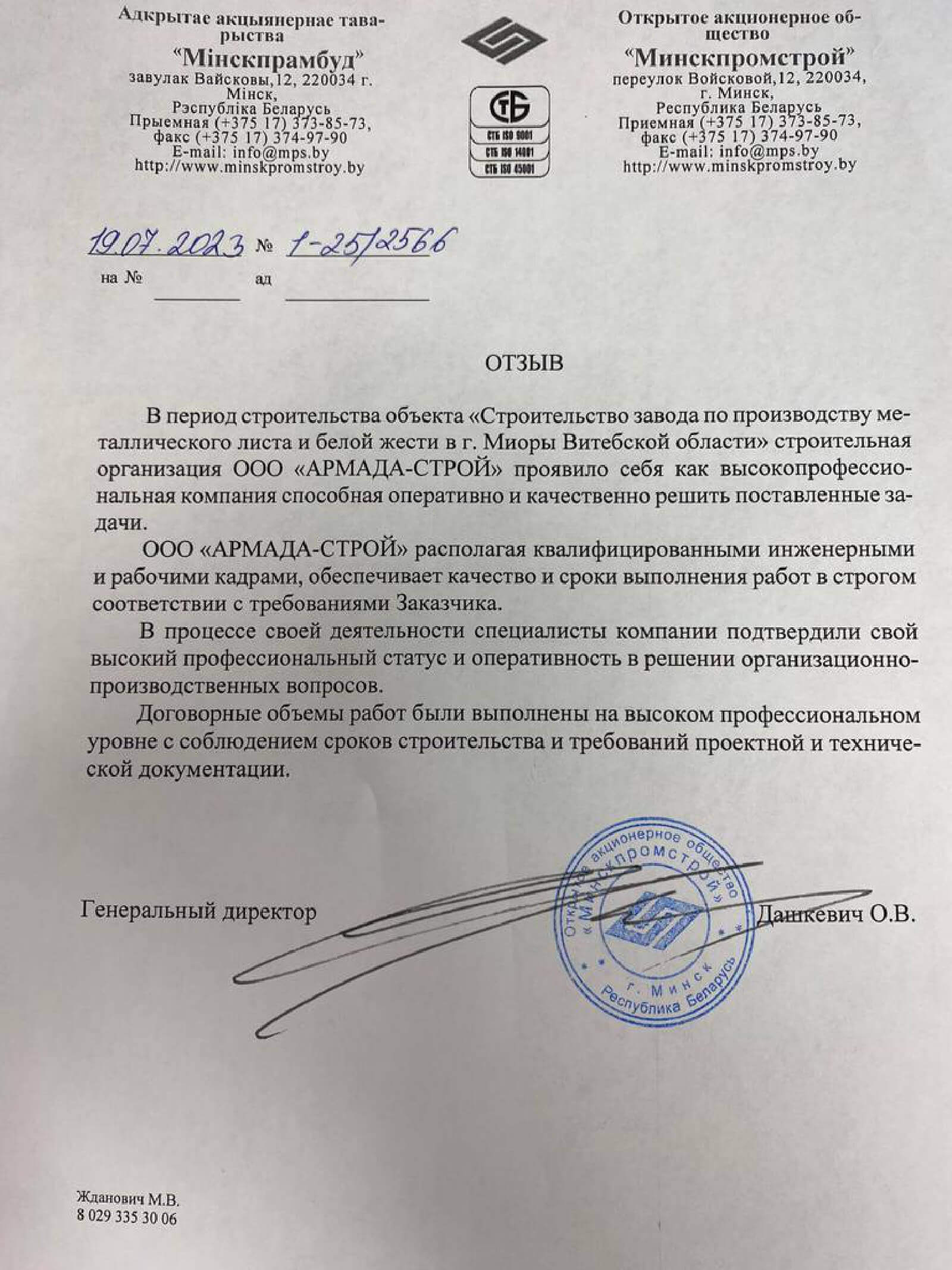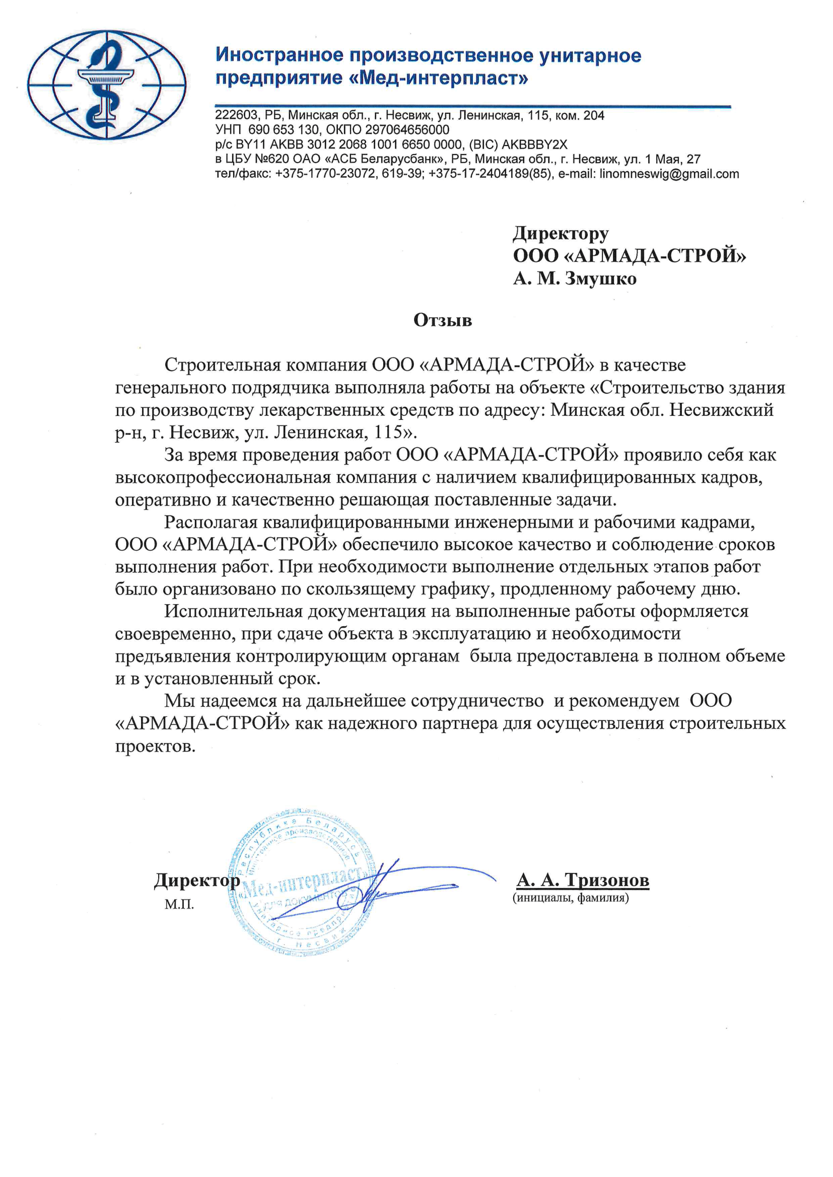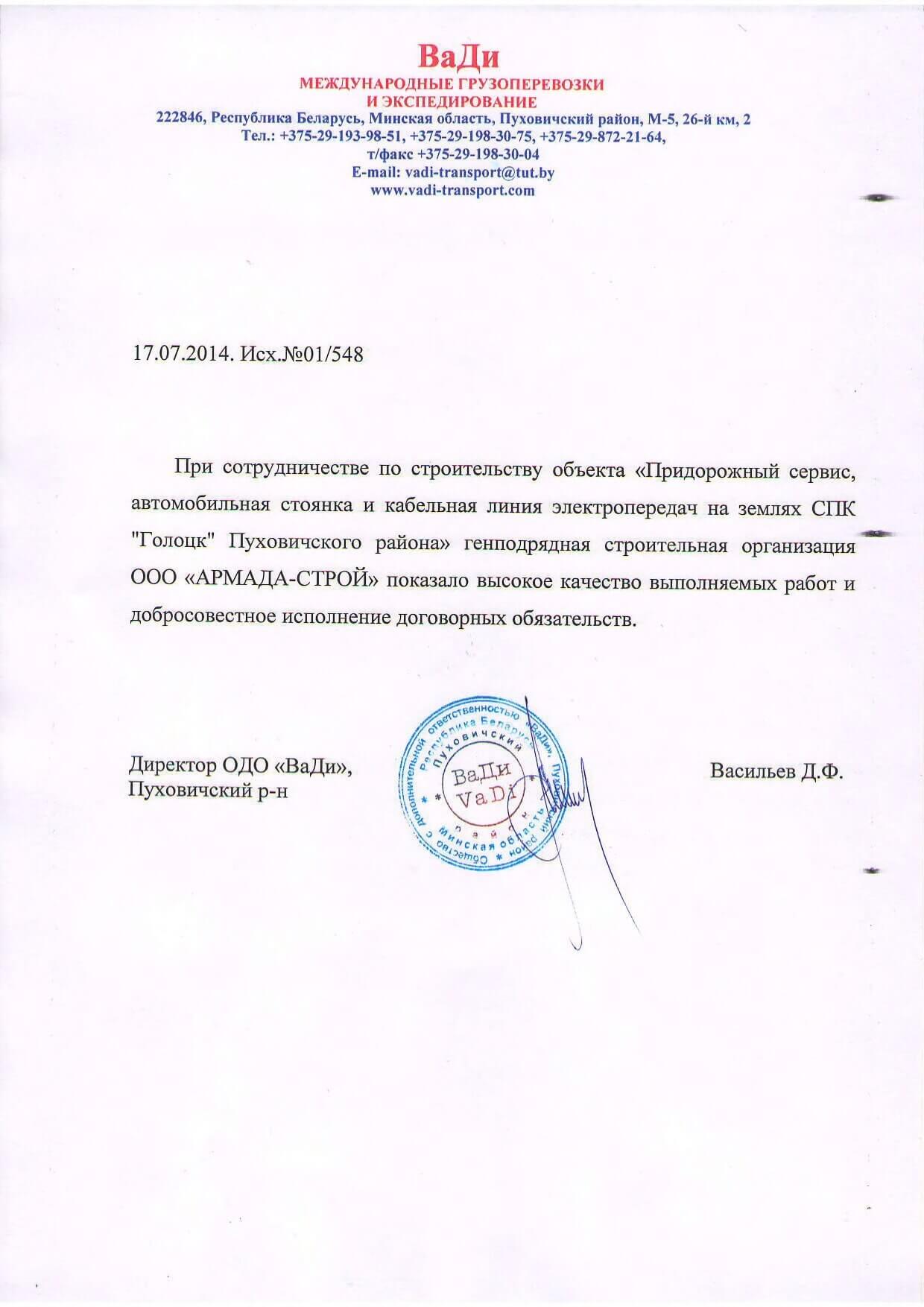 Отзывы заказчиков о сотрудничестве с «АРМАДА-СТРОЙ», о качестве и сроках выполненных работ. Благодарственные письма на официальных бланках организаций.