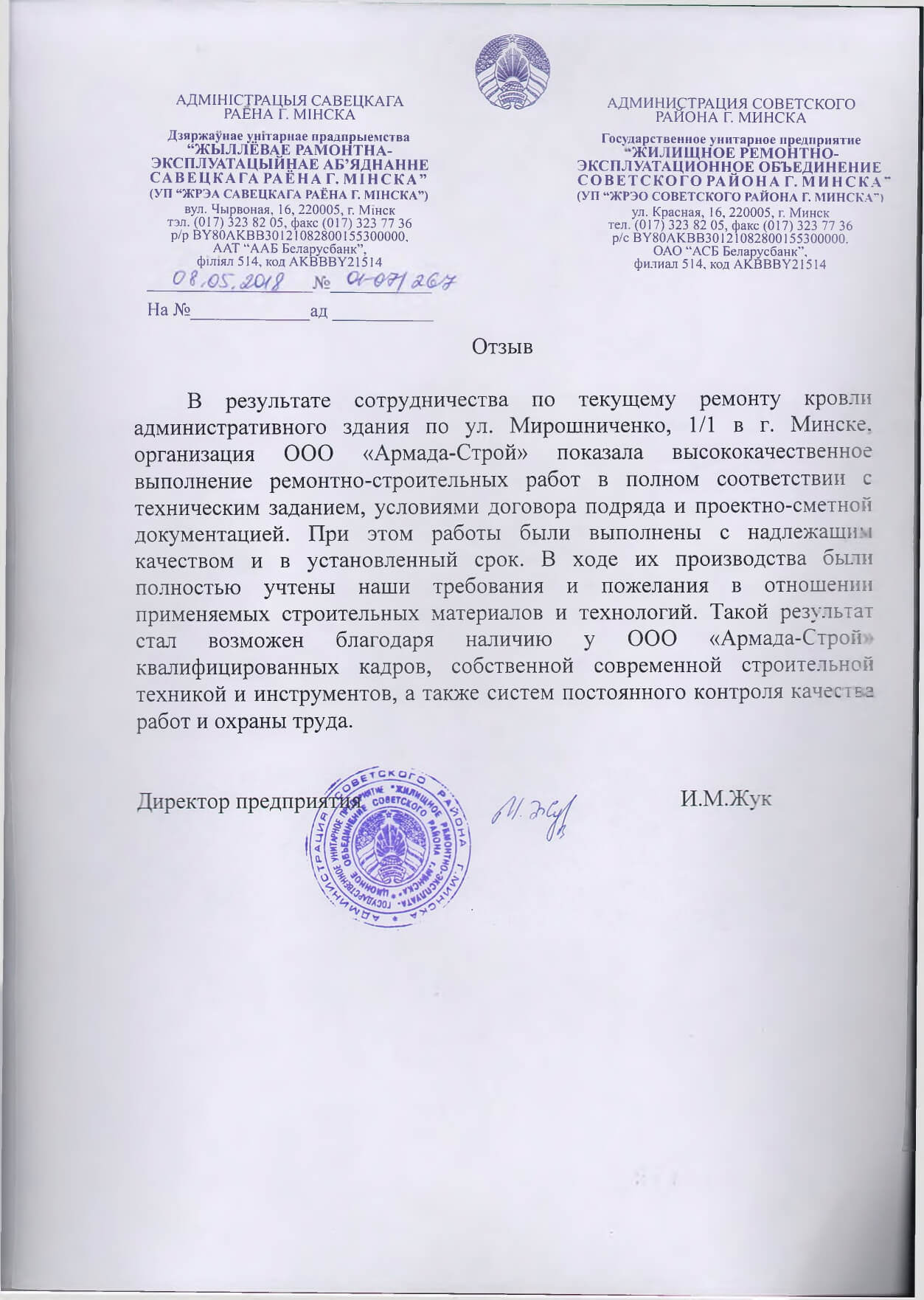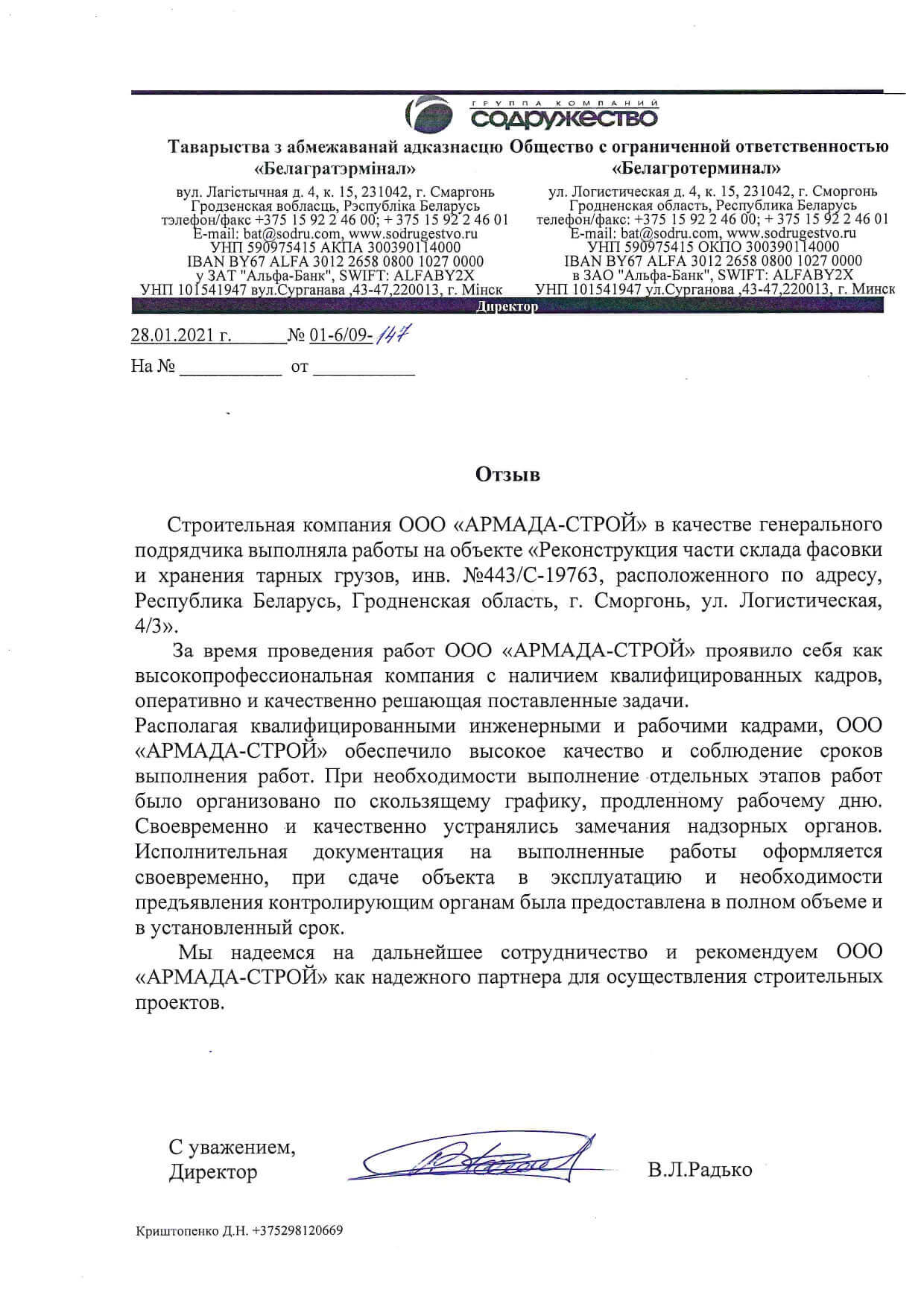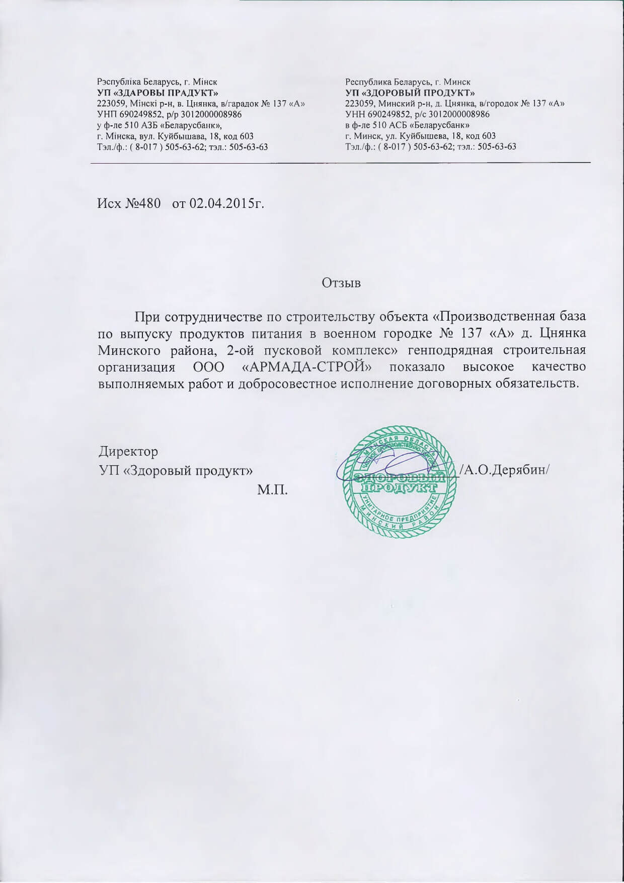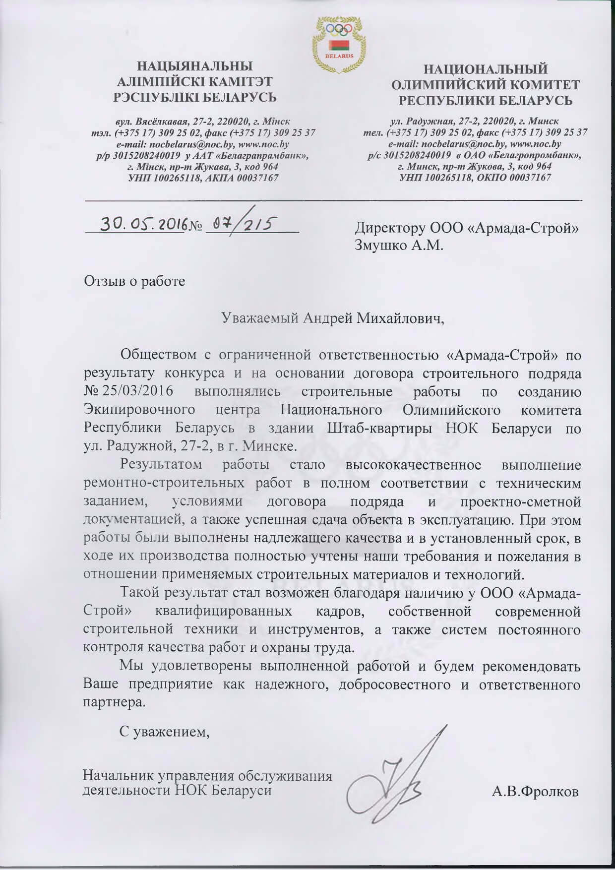Отзывы заказчиков о сотрудничестве с «АРМАДА-СТРОЙ», о качестве и сроках выполненных работ. Благодарственные письма на официальных бланках организаций.