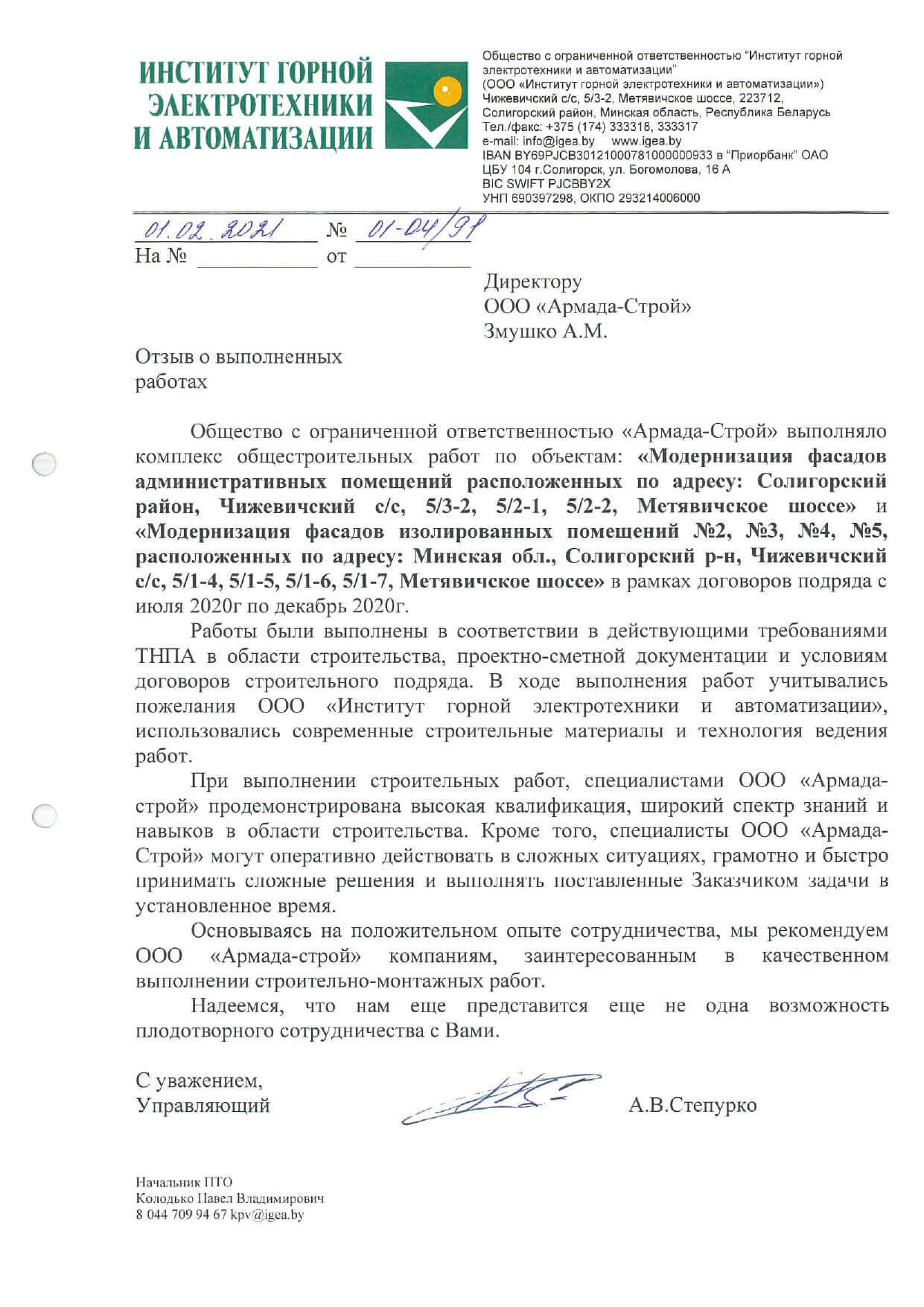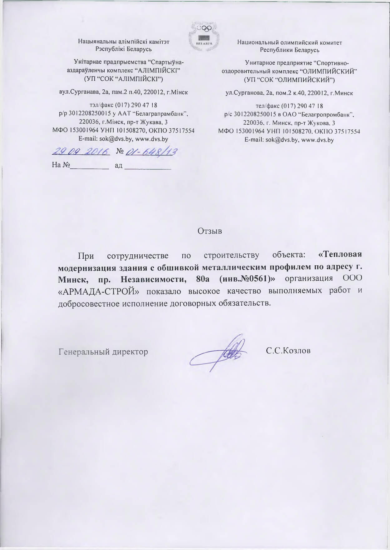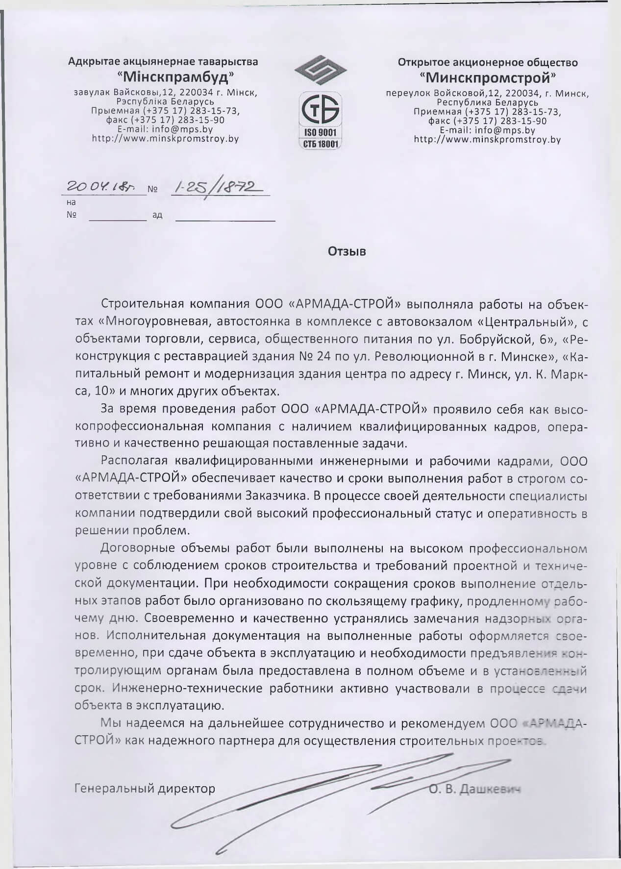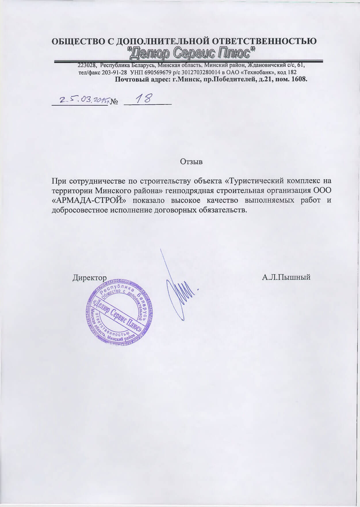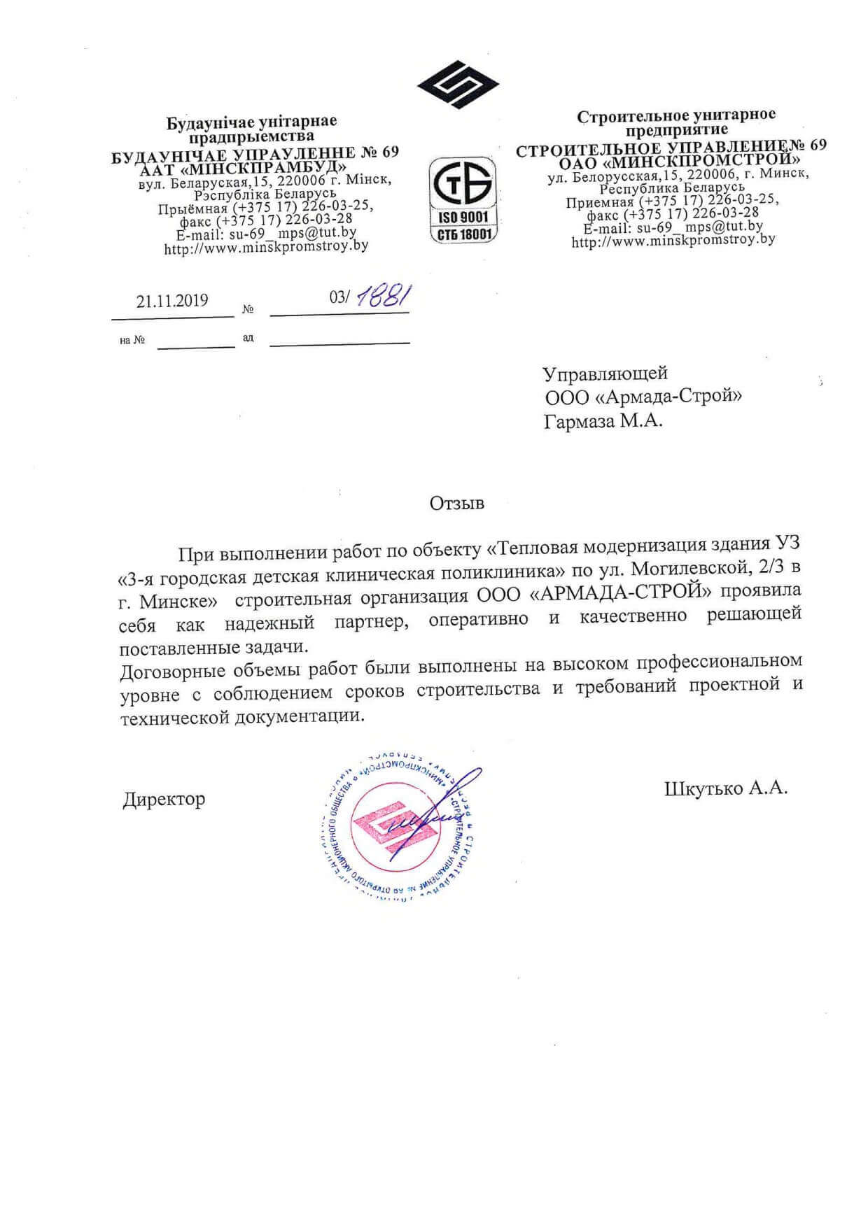 Отзывы заказчиков о сотрудничестве с «АРМАДА-СТРОЙ», о качестве и сроках выполненных работ. Благодарственные письма на официальных бланках организаций.